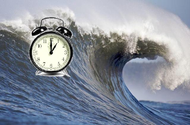 I don’t want to get all Isaac Asimov on you, but folks who know about these things (smart folks like the ones who used to sit behind you in science class and actually understood all that mumbo-jumbo, although they were clueless about important things like flirting and fashion) say that time is like a giant wave.  The tide pushes it into the shore while simultaneously dragging it back out again.  Time folds in on itself in a never-ending cycle.