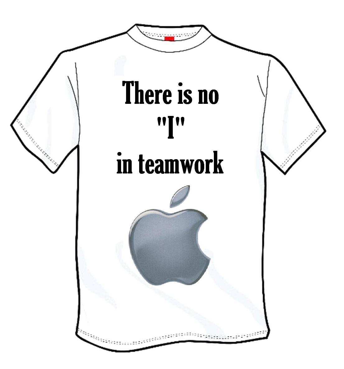 Which brings me to where I attempt the funny. Because corporations have these stupid employee engagement/team-building meetings all the time, and that slogan would usually be just the kind of junk any Human Resources cheerleader would go for. Except not at Apple… because they love the letter “I” and would never dis it.