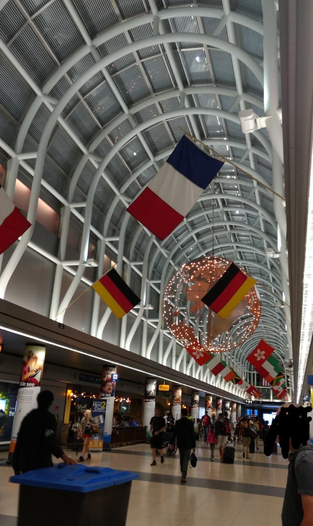 The brightly lit hallway featured a soaring, barrel vaulted ceiling festooned with brightly colored flags which, I assume, represented all the nations where American Airlines flew. It was light, airy, spacious and colorful. A little girl being dragged along by a frazzled woman stopped short in front of me, stared up at the ceiling and breathed, “Mommy, it’s beautiful!” Indeed.